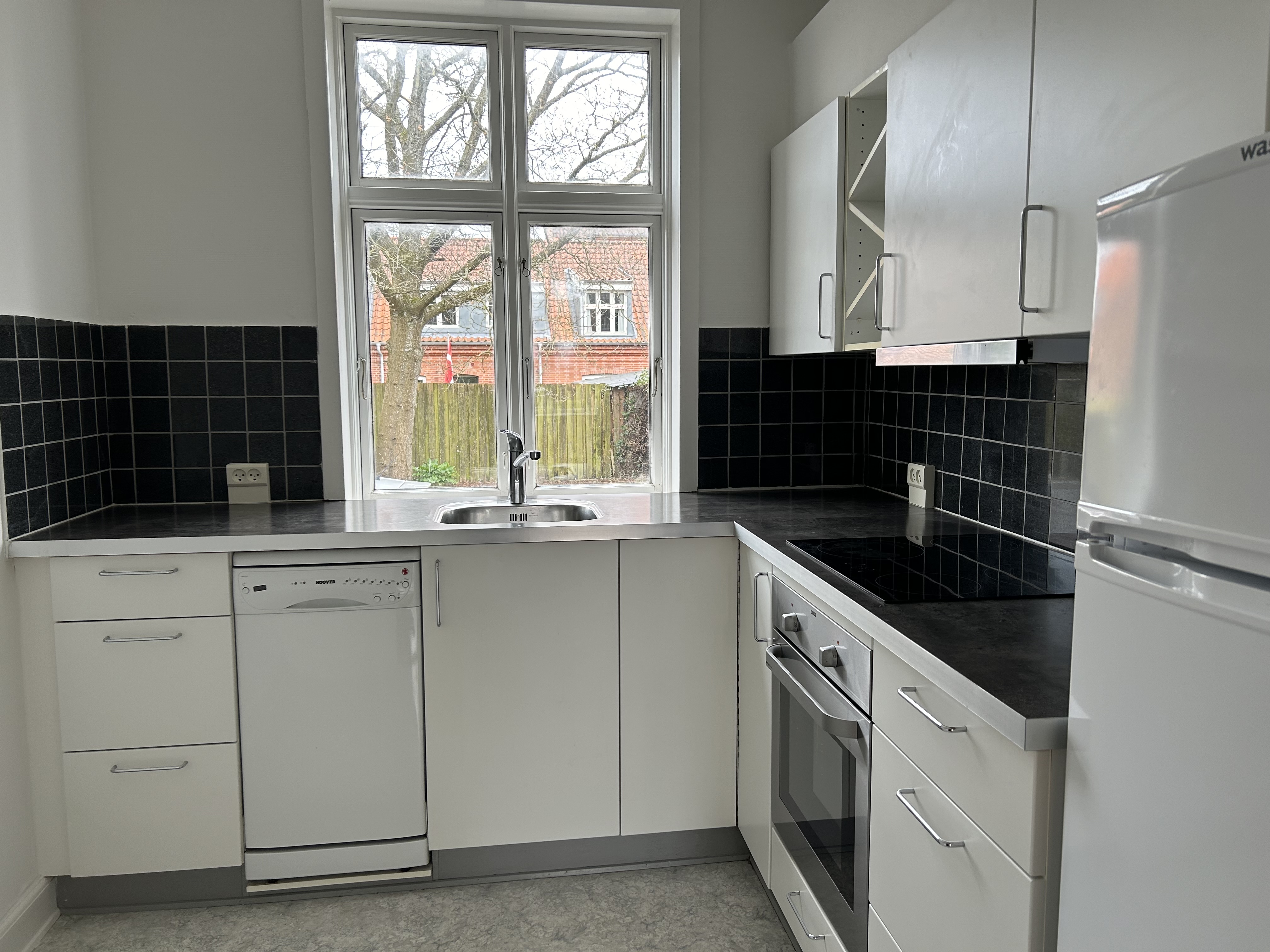 I lejligheden er en entre, et hvidt Kvik køkken med alt i hvidevarer - indbygget ovn, keramisk kogeplade, køle-fryseskab og opvaskemaskine. Der er et soveværelse, et værelse, en stue og et badeværelse.