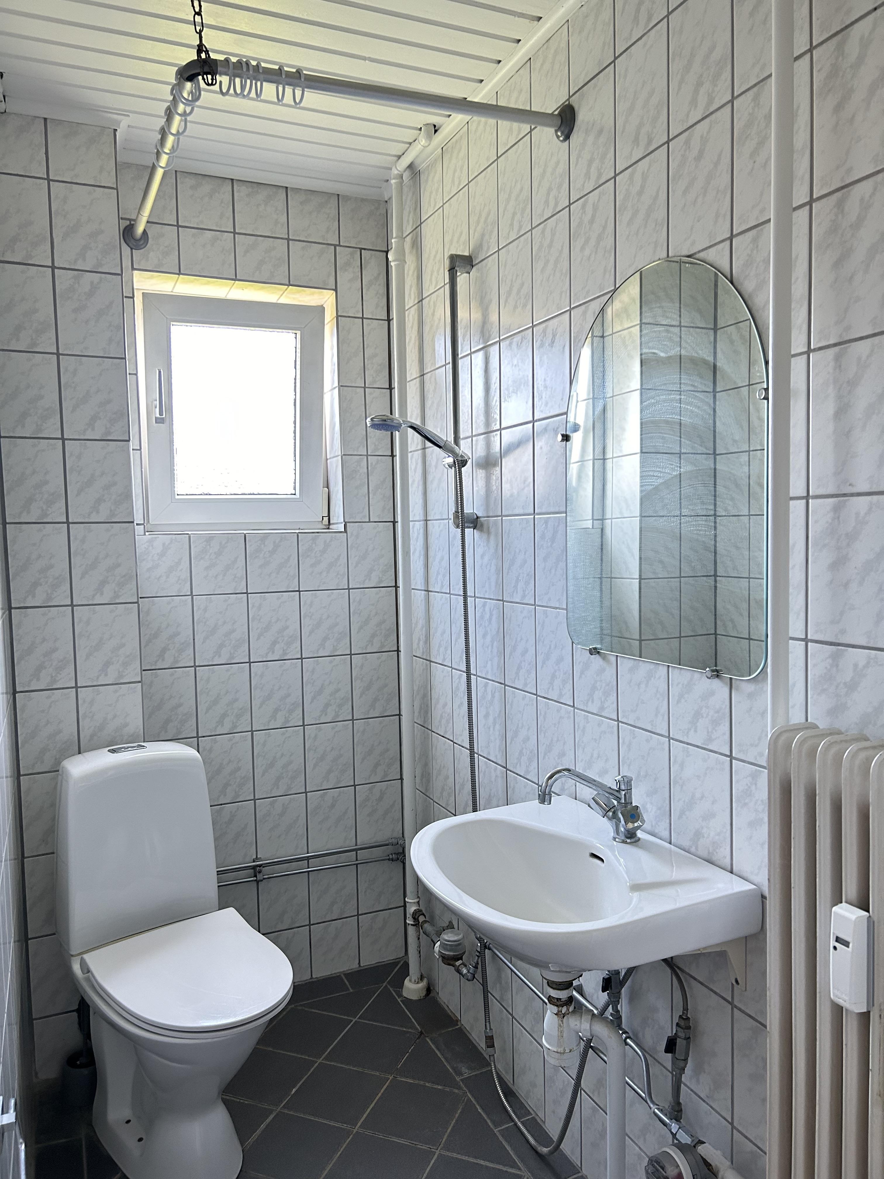 Der er et rummeligt badeværelse, en lys stue samt et soveværelse med indbyggede skabe.