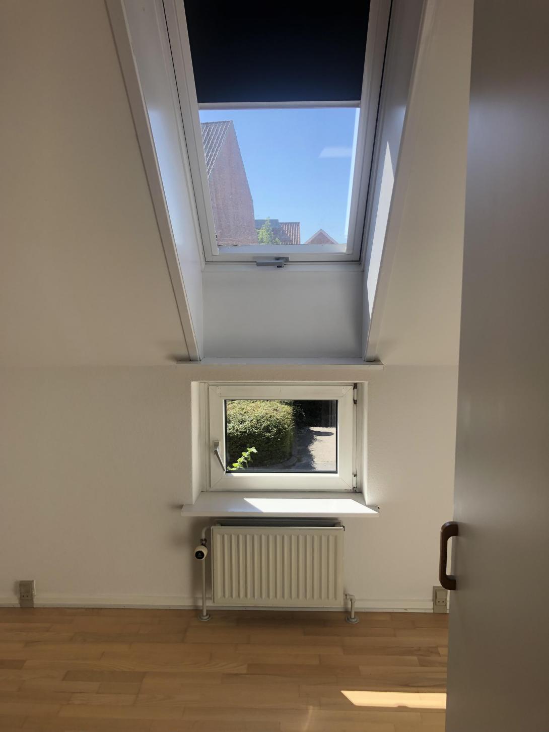 På 1. sal er der et badeværelse, et soveværelse med faste skabe samt 2 værelser.