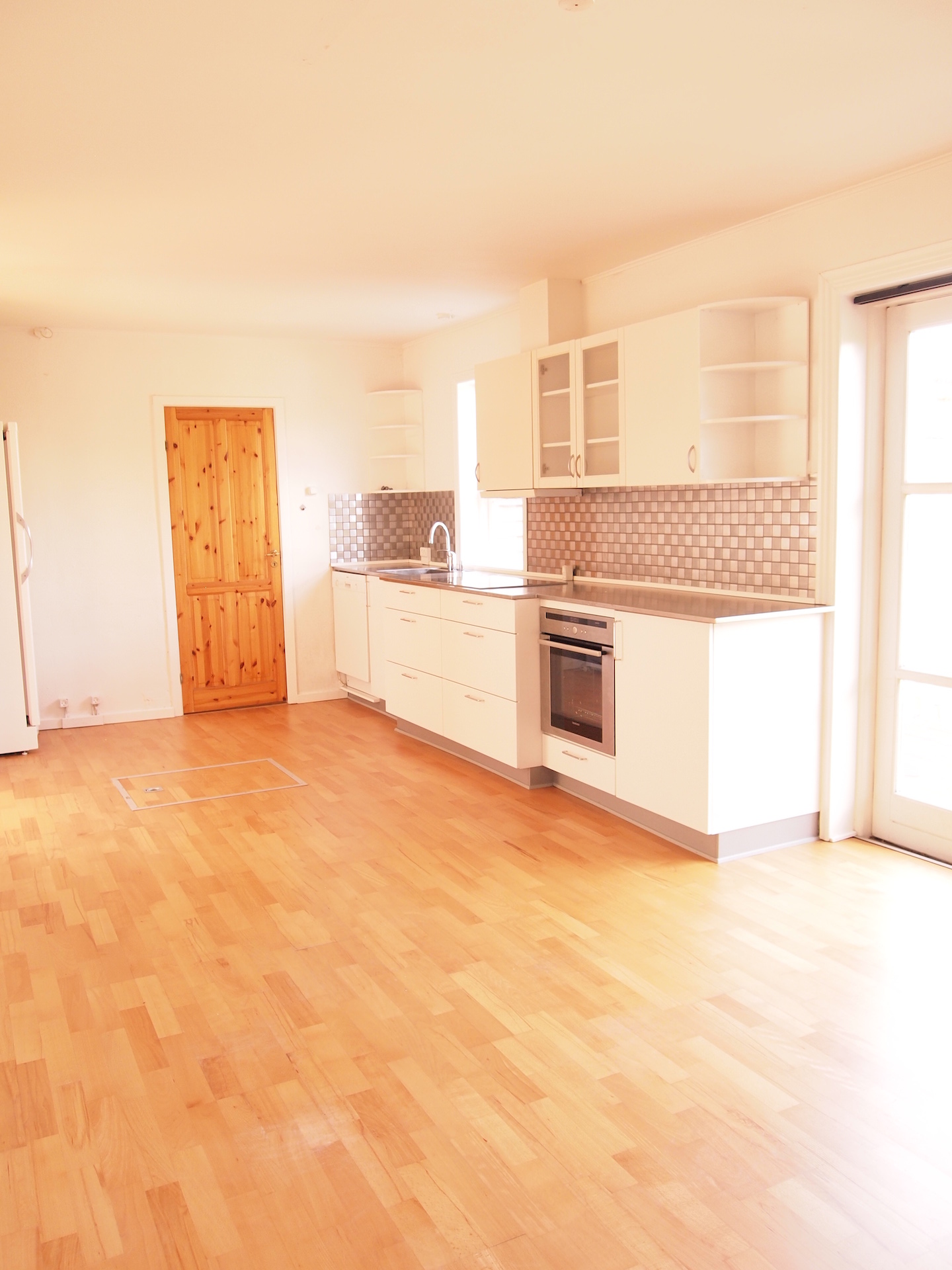 Huset indeholder: stor entre med faste skabe, vaskemaskine og tørretumbler. Hvidt Viva-Kvik køkken med alt i hvidevarer - stor spiseplads og udgang til terrasse og have. Nyere badeværelse, stor stue og værelse.