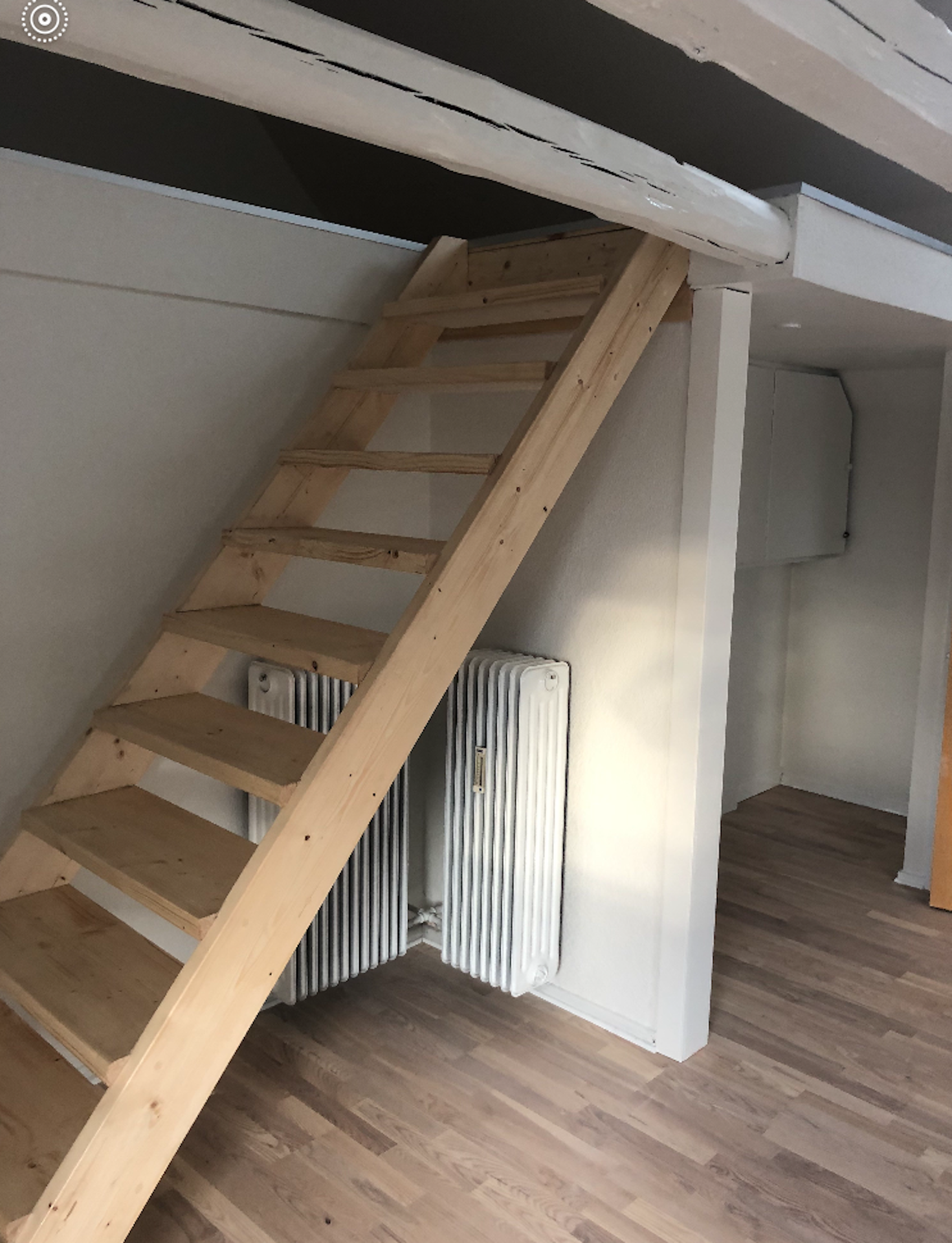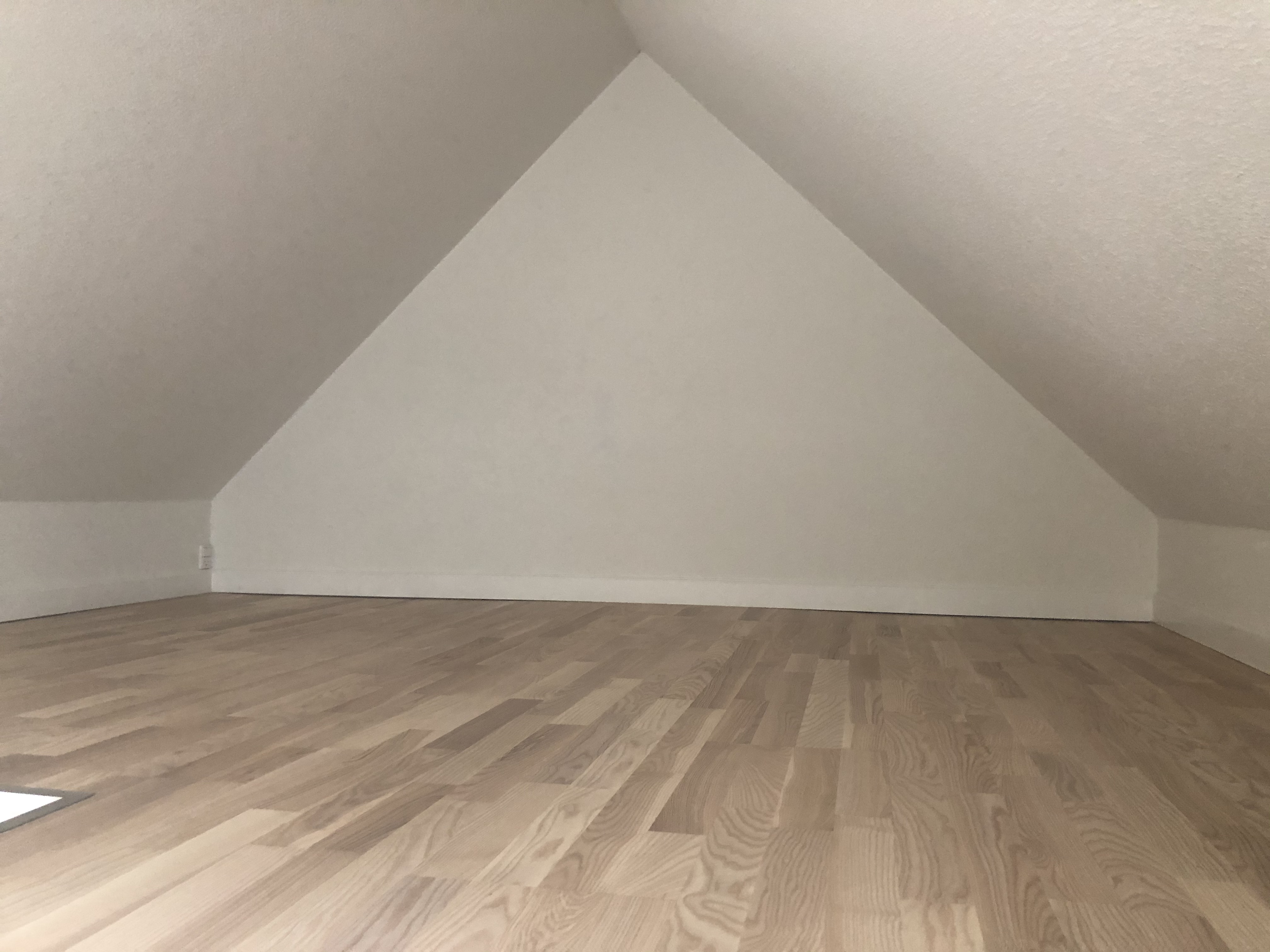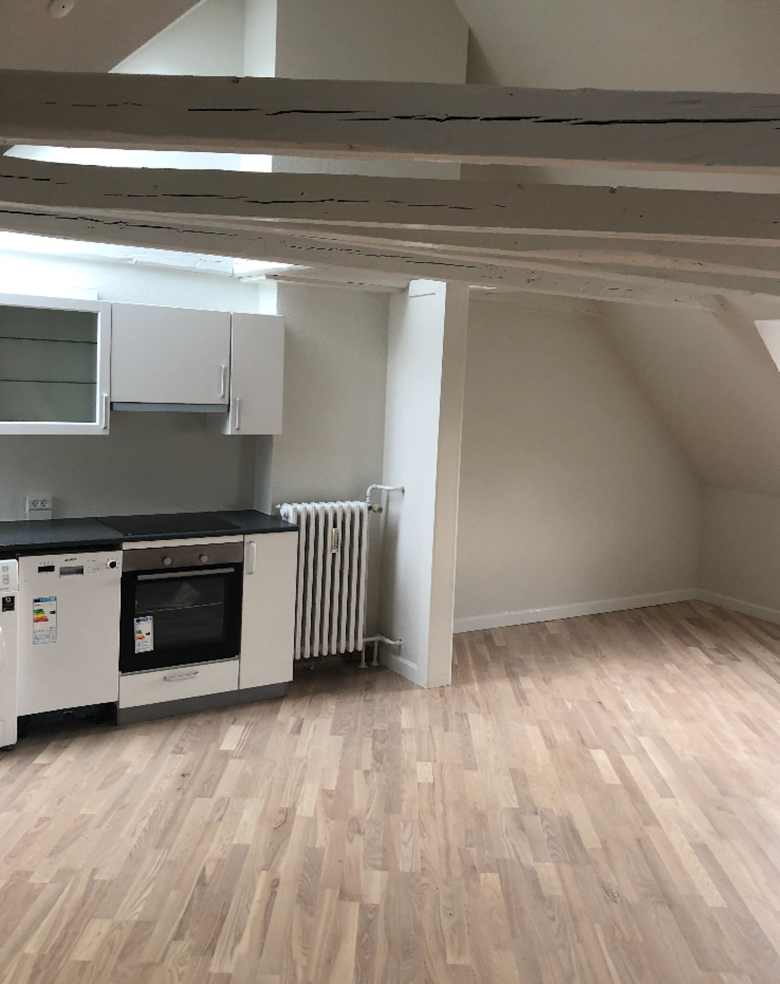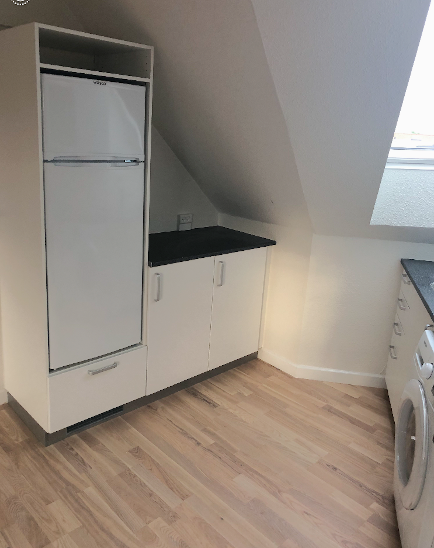 Lejemålet indeholder indgang i åbent køkken/stue, hvor der er loft i kip og tagvinduer med godt lysindfald.