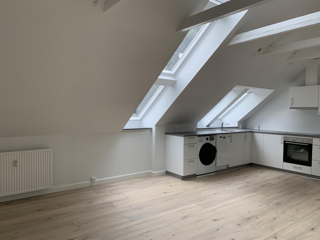 I lejligheden er et hvidt Kvik køkken med alt i hvidevarer - indbygget ovn, køle-fryseskab, keramisk kogeplade og opvaskemaskine. Køkkenet er i åben forbindelse med stuen og der er loft til kip og mange ovenlysvinduer. Der er et soveværelse, et værelse samt et badeværelse.