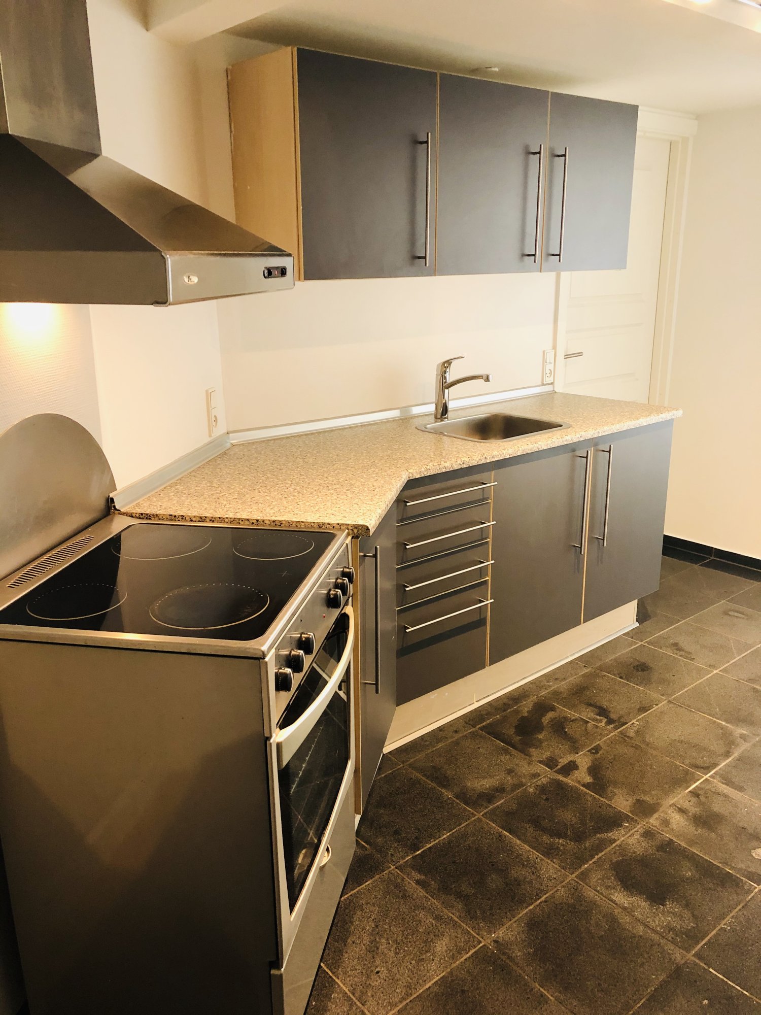 I lejligheden er et køkken med alt i hårde hvidevarer - køle-fryseskab, komfur og opvaskemaskine.