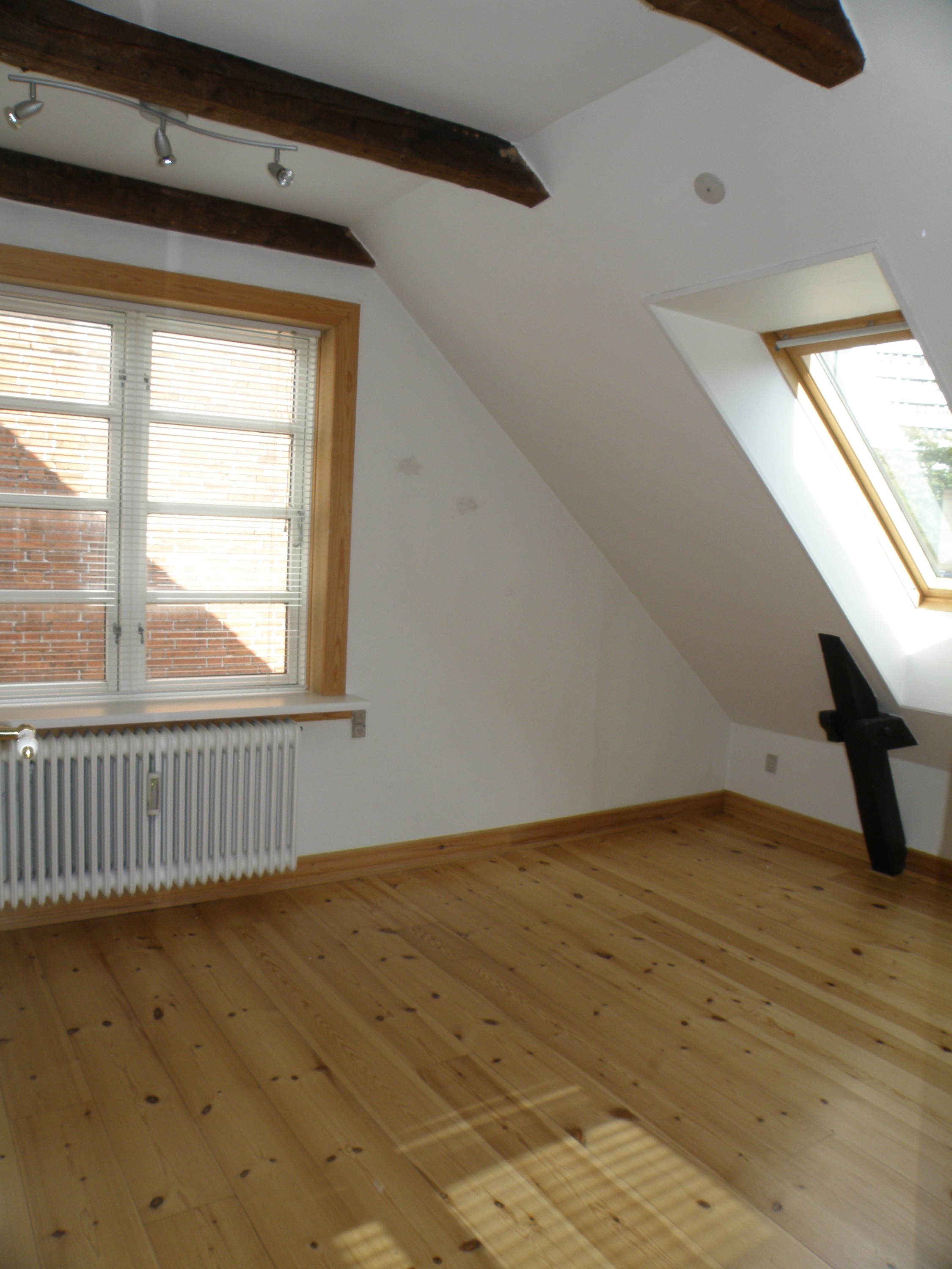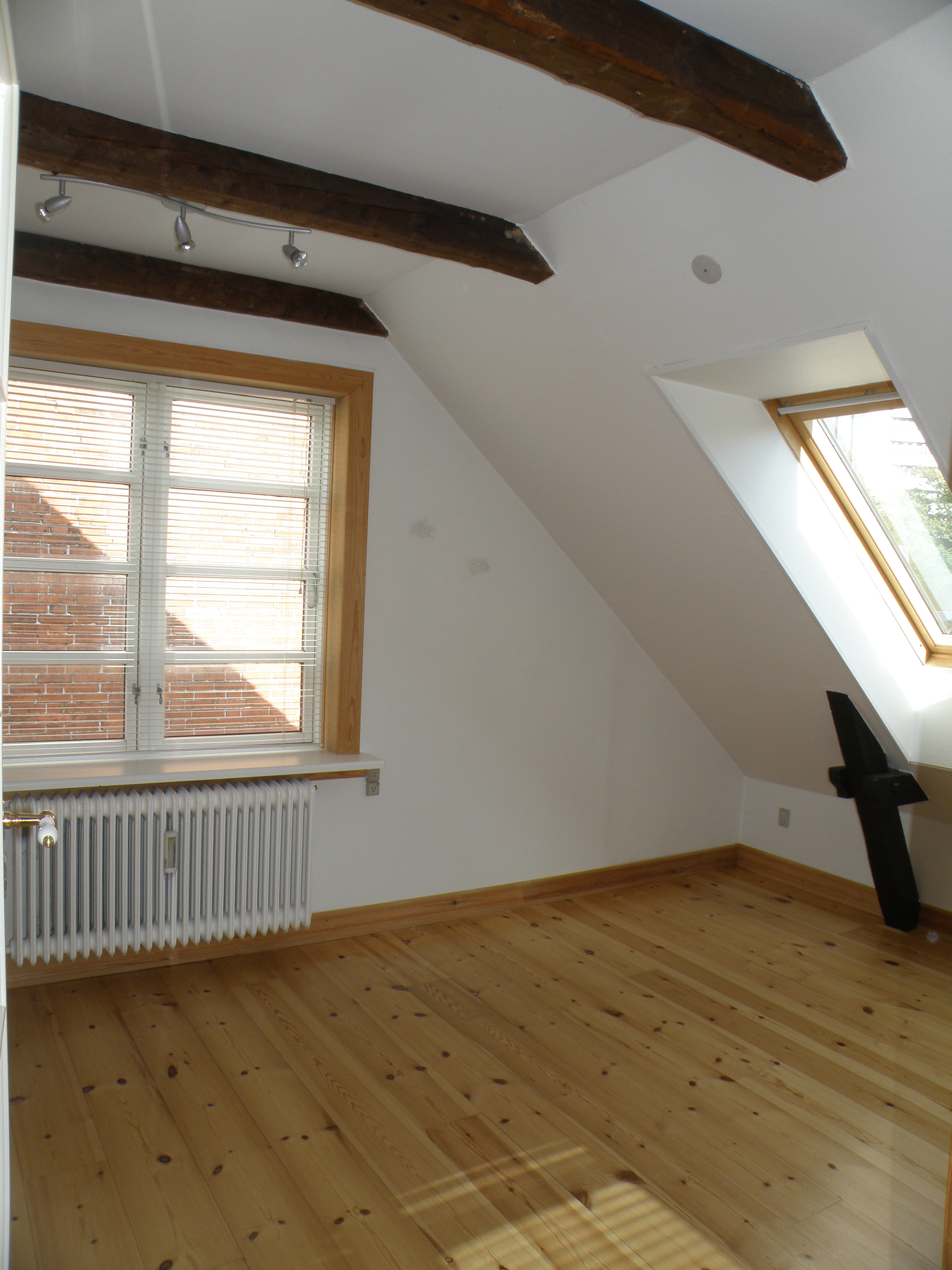 Der er fritliggende bjælker, loft til kip samt masser af tagvinduer, hvilket gør lejligheden helt speciel.